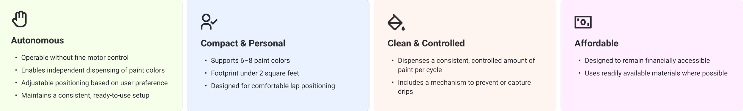 Validate requirements before prototyping. We initially moved into prototyping without fully understanding key contextual details, such as how many paints James uses, how he cleans his brushes, and how frequently he paints. This highlighted the importance of clarifying constraints early to avoid rework.