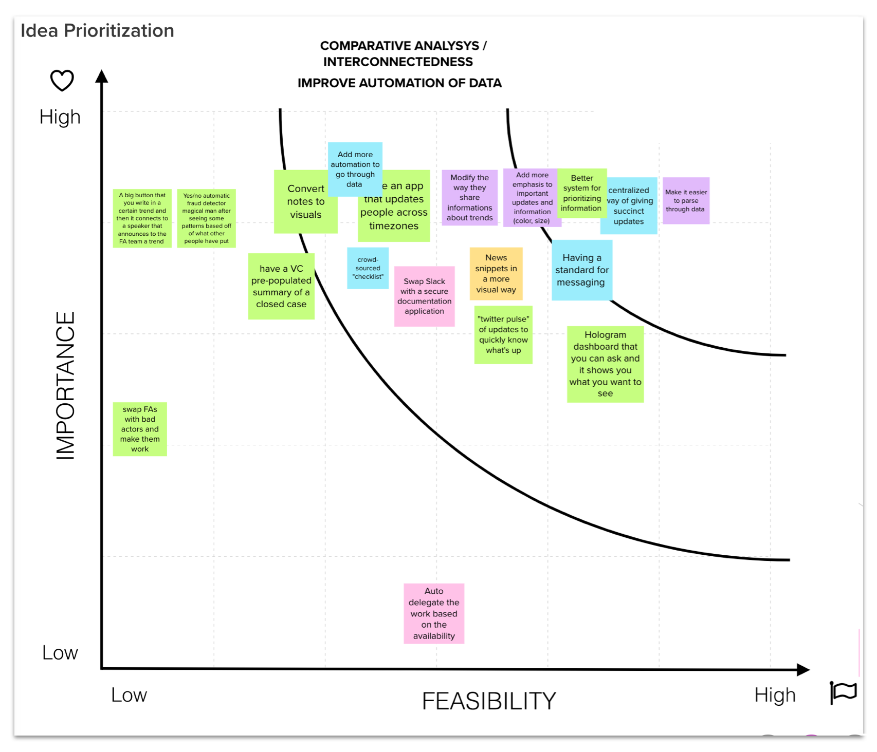 After completing our research, we moved on to the ideation phase to brainstorm design concepts. We used an affinity diagram to group common ideas and were able to establish three main areas of opportunities that informed our design explorations. We also completed a prioritization grid with our stakeholders to narrow down our ideas based on user needs, feasibility, and priority,
