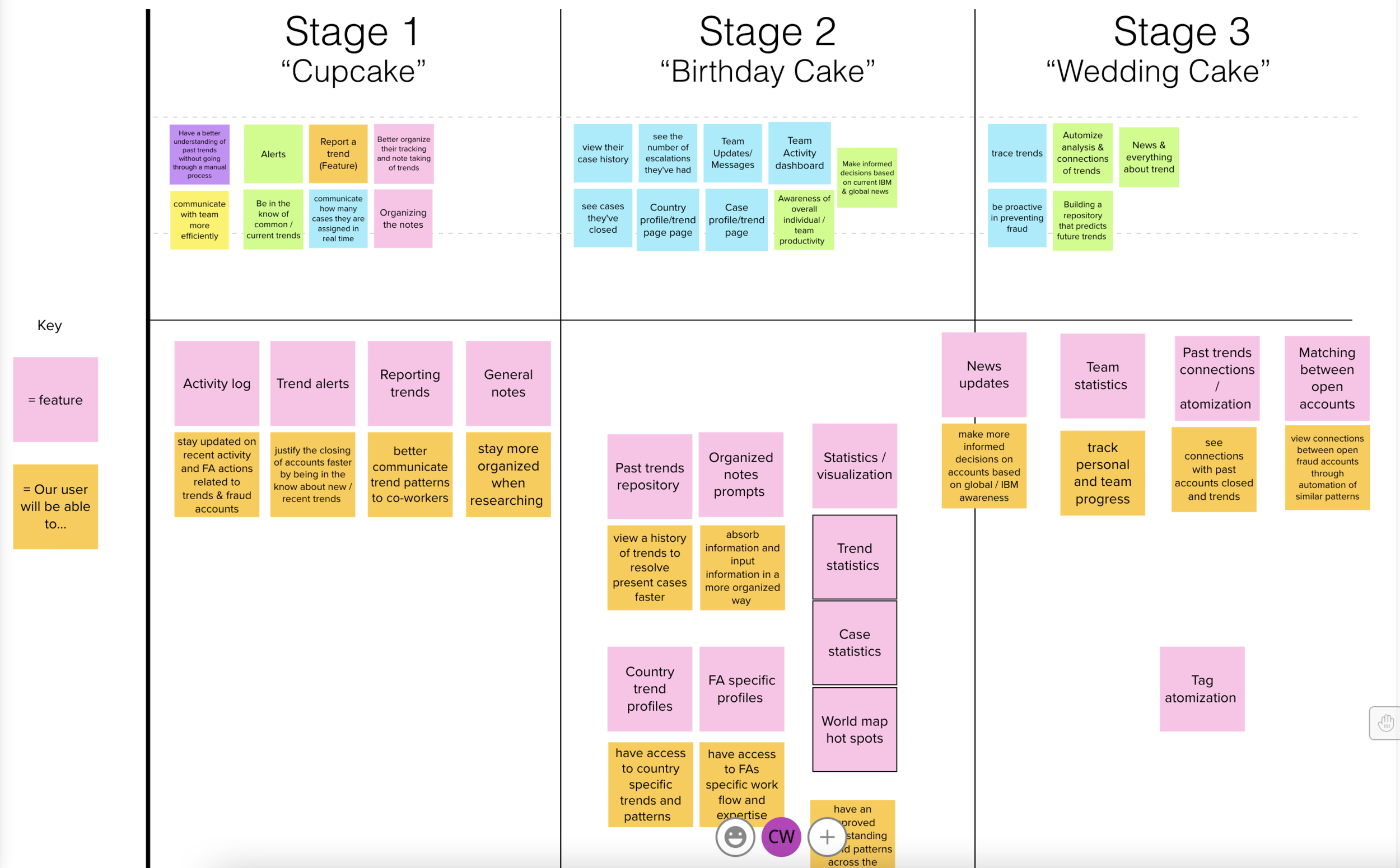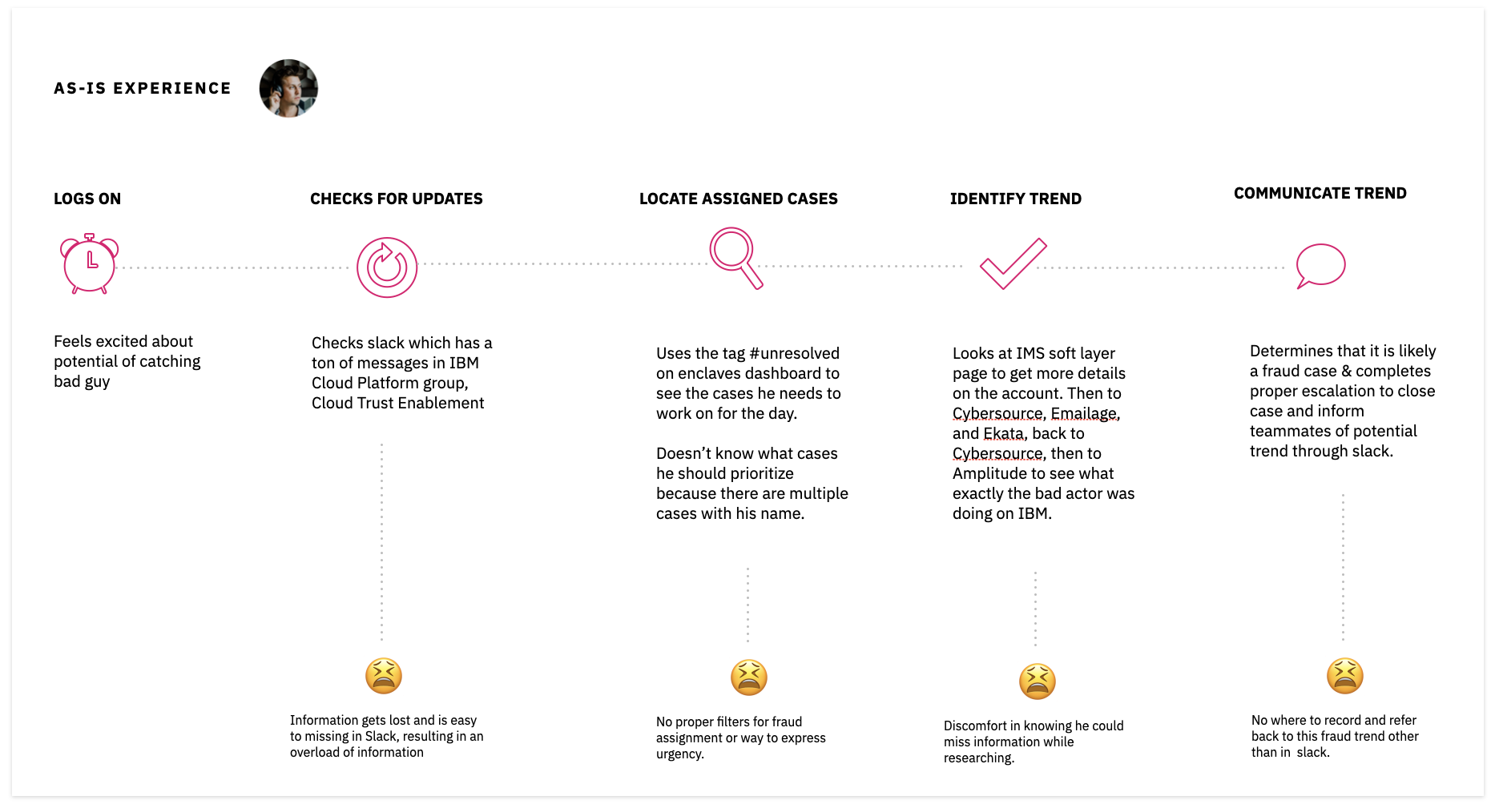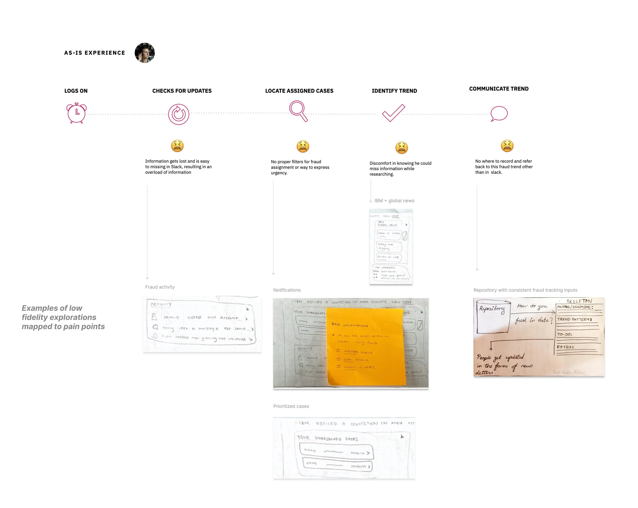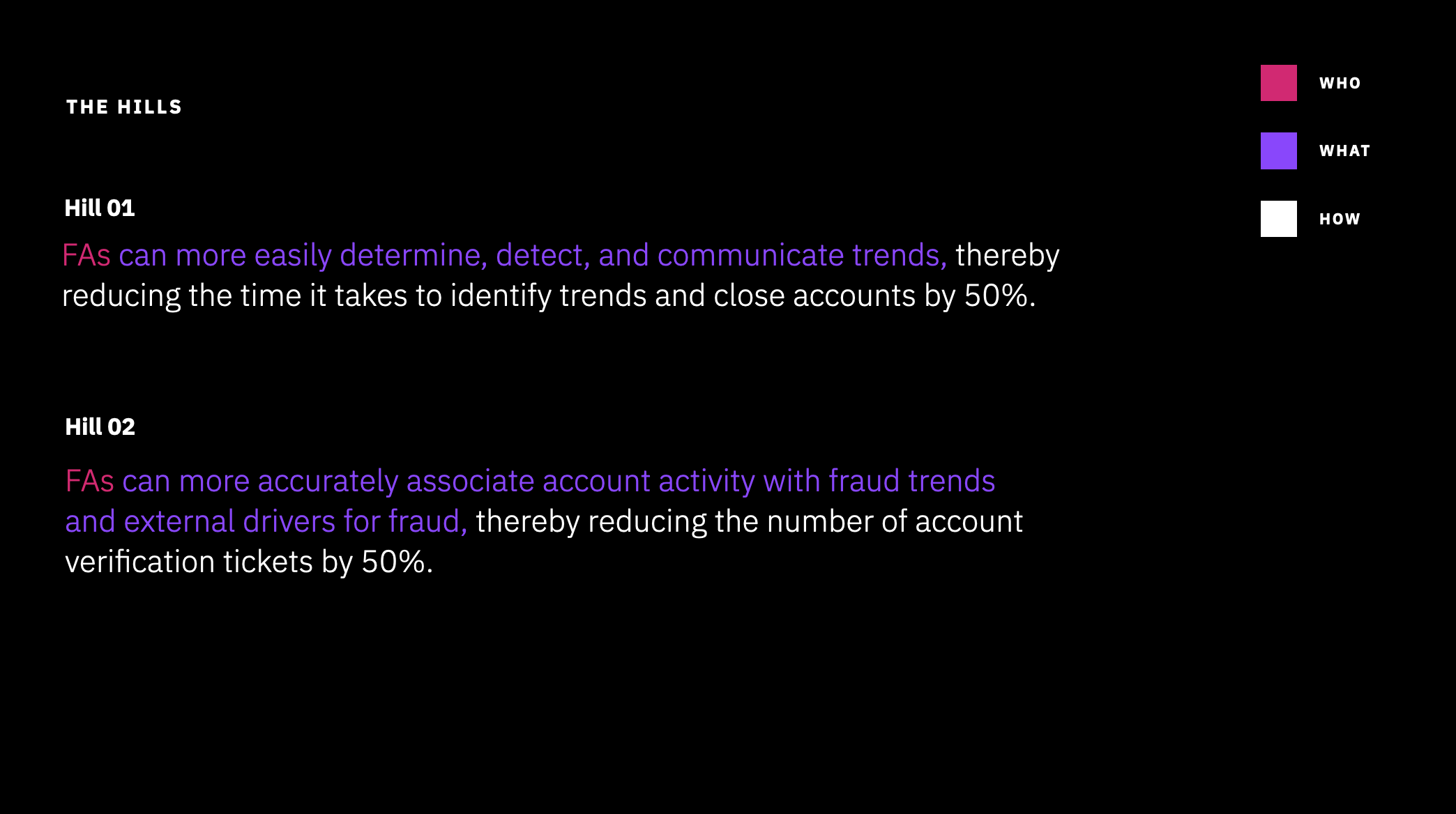 We then created an as-is scenario map to align on how fraud analysts’ currently find, track, and communicate trends. This visual reference allowed us to identify pain points to narrow down the scope of our ask into hills.