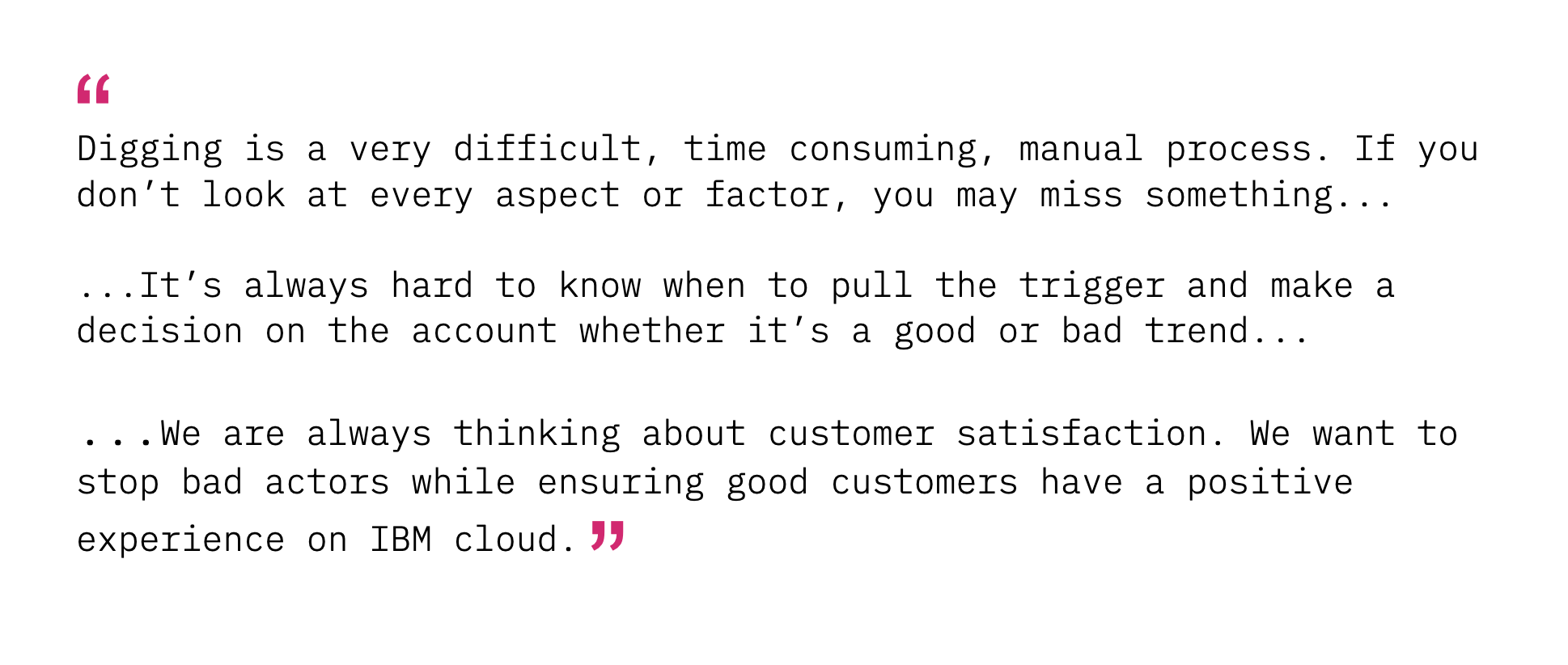 One of IBM Cloud’s key differentiators is security and compliance helping IBM be secure to the core. IBM Fraud Analysts work around the clock to identify and close accounts committing fraudulent activity such as bitcoin mining, identity theft, dark web hosting, illegal activity, and shoe botting.