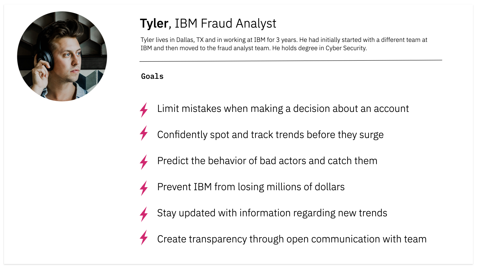 With a focus on user outcomes, we translated our research findings into a user persona and identified our persona’s main goals.