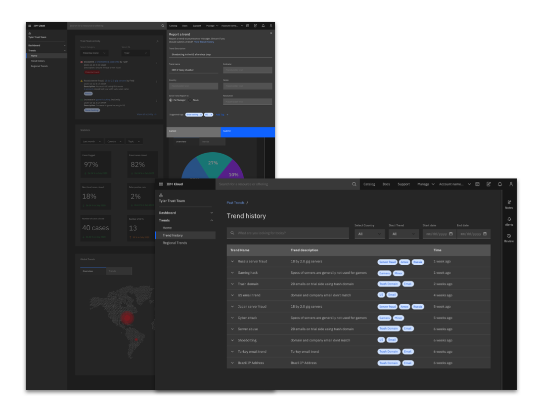 A visionary concept for a fraud trend tracking experience for fraud analysts.